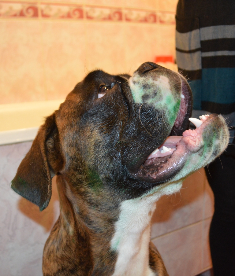 рисовала картину масляными красками, палитра лежала на стуле, пока я ушла, Дижон смешивал краску на палитре мордой :D :D :D :D