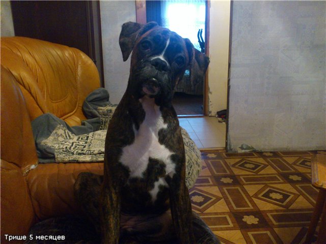 Добрый день, уважаемые форумчане-боксероводы! Решила присоединиться к вашей компании и познакомиться. Меня зовут Елена, мою девочку Триша. Родилась она 05,08,12. Это моя вторая собака. Первая, тигровая девочка, прожила с нами 13 лет. После того как ее не стало, дом просто опустел. Никто не встречал, не лез с поцелуями. Муж за 2 недели похудел на 8 кг.
