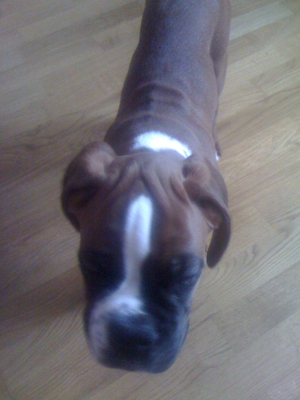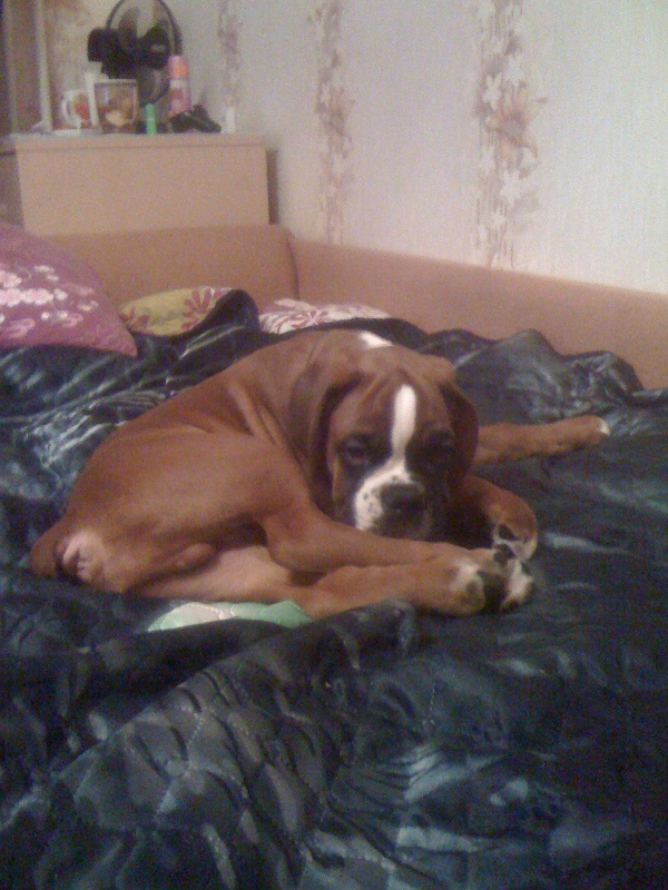 Всем привет. Вот решил показать Вам своего боксера. Фотографий четких пока нет. Только успеваю на телефон, что то снять. Не можем долго стоять на одном месте. ) Возможность с фотографировать только когда спим или когда только проснулись.